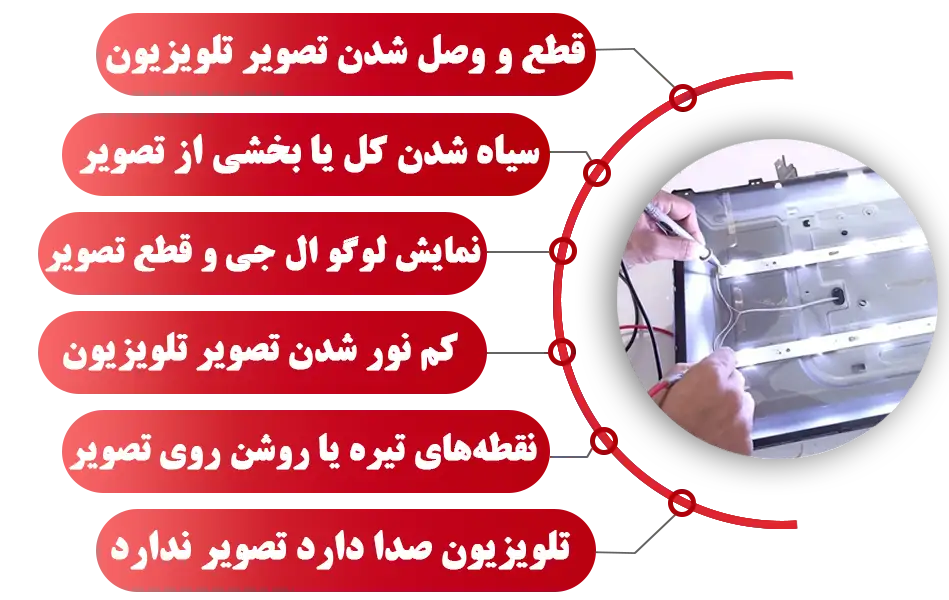 • در اکثر مواقع خرابی از بک لایت تلویزیون می باشد. در موارد کم احتمال خرابی برد پاور وجود دارد.